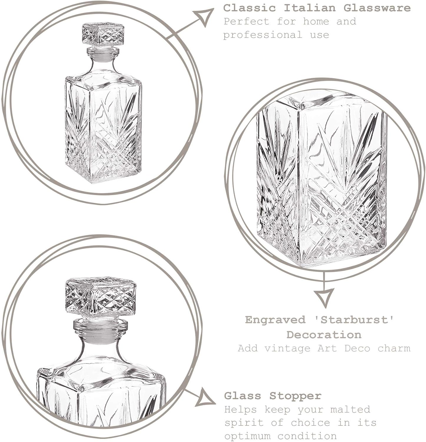 The Bormioli Rocco Selecta Whiskey Decanter exemplifies timeless craftsmanship and Italian elegance. This decanter is not only a stylish addition to any bar cart or drinkware collection but also a functional item that preserves the aroma and quality of your spirits. Made with high-quality glass and enhanced with a striking starburst pattern, the Selecta decanter offers a satisfying blend of vintage charm and modern practicality.